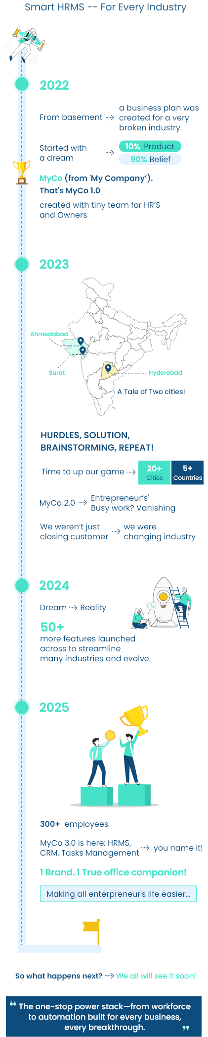At MyCo, we are dedicated to transforming the way all businesses in India operate. Our flagship offering, the TotalBiz Suite, is a comprehensive, mobile-optimized platform designed to streamline HR, sales, operations, and more. As a leading provider of HRMS software in India, we ensure that businesses can manage their operations efficiently, anytime and anywhere.